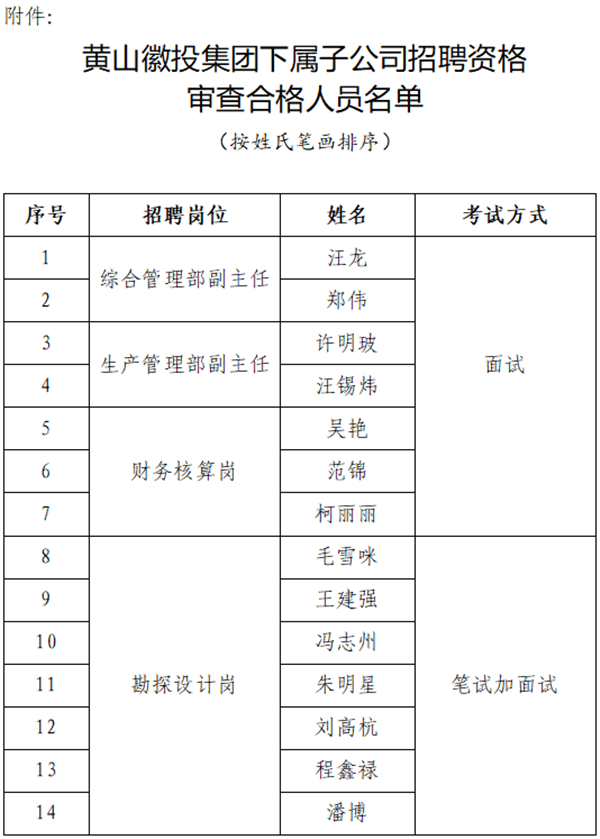 附件:黄山徽投集团下属子公司招聘资格审查合格人员名单