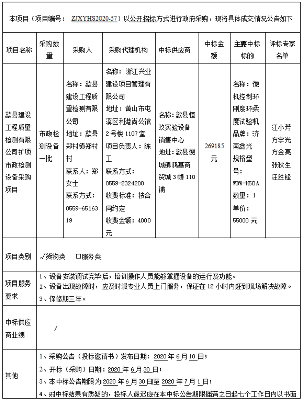 歙县建设工程质量检测有限公司扩项市政检测设备采购项目中标公告