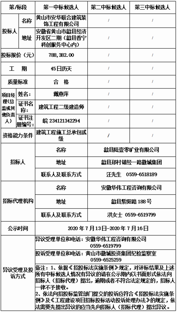 安徽华伟工程咨询有限公司受歙县陆壹零矿业有限公司的委托,对(HJSGC2020HWSY029、歙县陆壹零矿业有限公司门卫室及附属工程、办公楼、厨房、餐厅改造及附属工程)进行(小型项目邀请招标),本项目于(2020年7月13日)在(歙县陆壹零矿业有限公司)开标、评标,现根据有关法律、法规要求,对中标候选人进行公示。